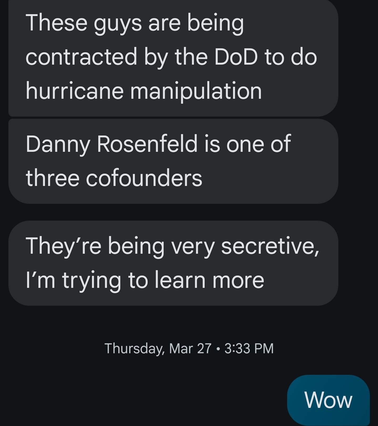 Is taming, turning, or destroying a hurricane a noble cause? Sure. Can the same technology be weaponized? Likely. Why would the Department of Defenses DIU be invested in an AI startup involving weather prediction and hurricane modification? The answer is obvious: