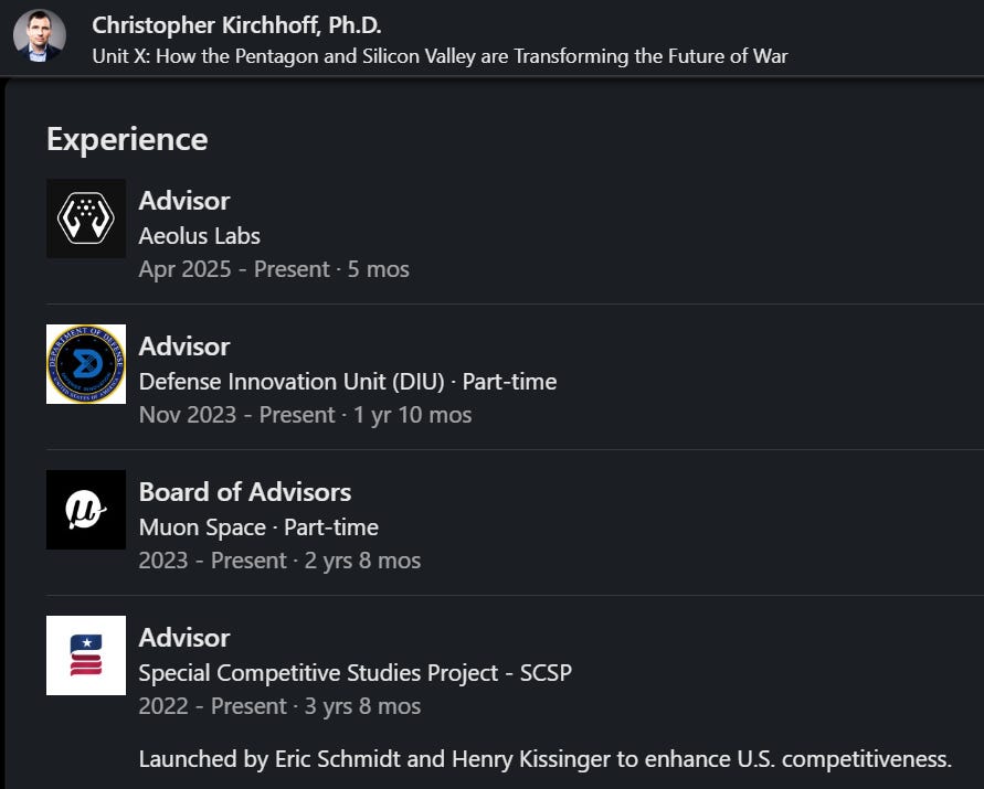 Christopher Kirchhoff is an expert in emerging technology who founded the Pentagon’s Silicon Valley office and has led teams for the President, Chairman of the Joint Chiefs of Staff, and CEO of Google. He recently worked special projects at Anthropic. Previously, Dr. Kirchhoff helped scale $1 billion in philanthropic programs at Schmidt Futures. He also founded and led the Pentagon's Silicon Valley Office, Defense Innovation Unit X, which piloted flying cars and microsatellites in military missions and created a new acquisition pathway for start-ups now responsible for $70 billion dollars of technology acquisition. During the Obama Administration, he was Director for Strategic Planning at the National Security Council and the senior civilian advisor to the Chairman of the Joint Chiefs of Staff. Together with Raj Shah, he is the author of Unit X: How the Pentagon and Silicon Valley are Transforming the Future of War.